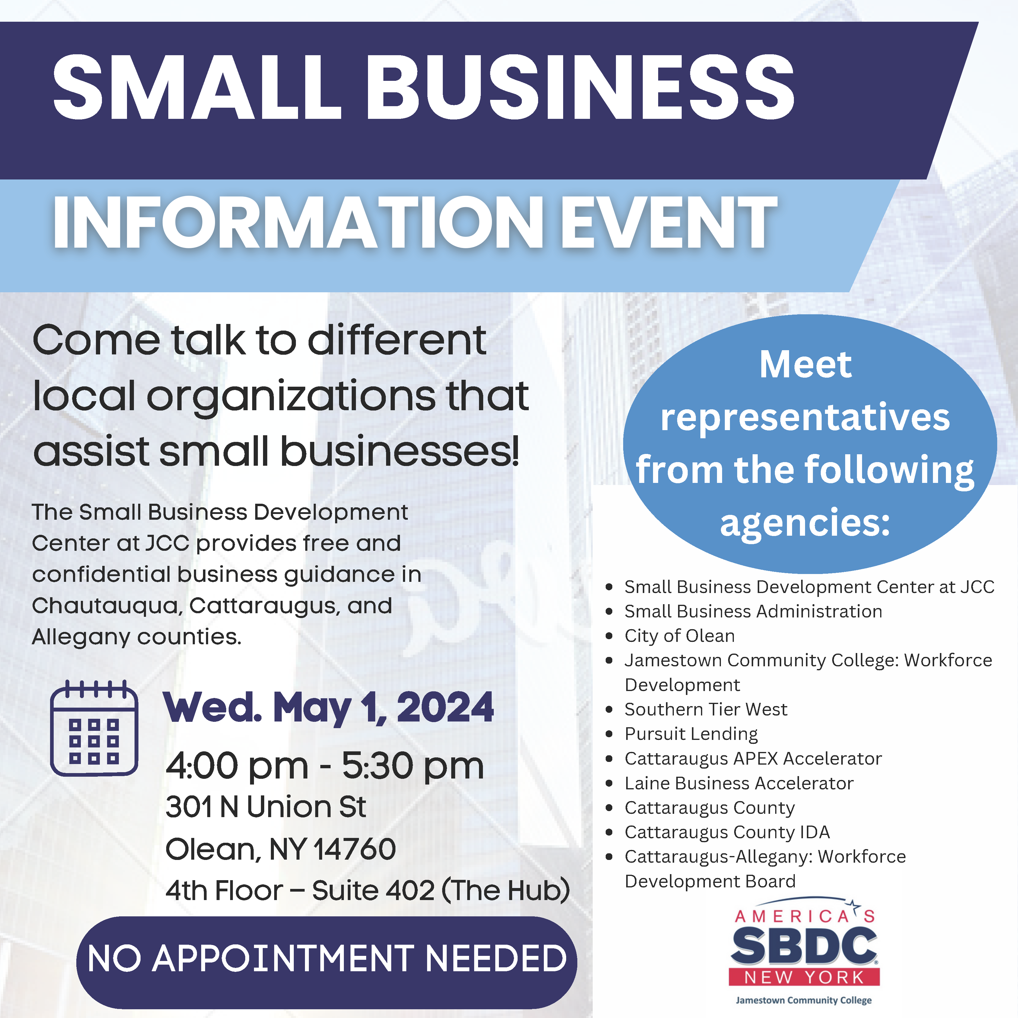 The Small Business Development Center at JCC provides free and confidential business guidance in Chautauqua, Cattaraugus, and Allegany counties.